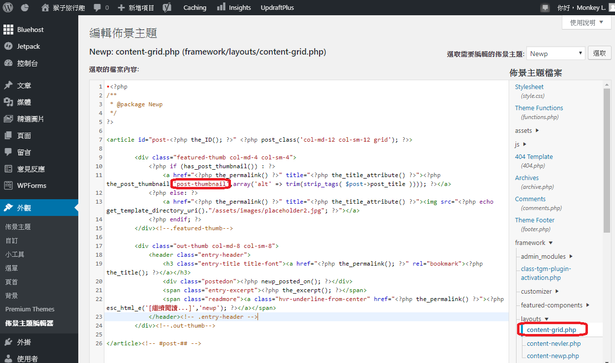 (1) 先利用Bluehost提供的FTP功能,把目前使用的「Newp」佈景主題程式碼都下載下來。然後我把在3個不同位置出現的類似佈景主題檔案,把最接近我想要顏色的darkbrown都copy成monkey這個新的檔案。